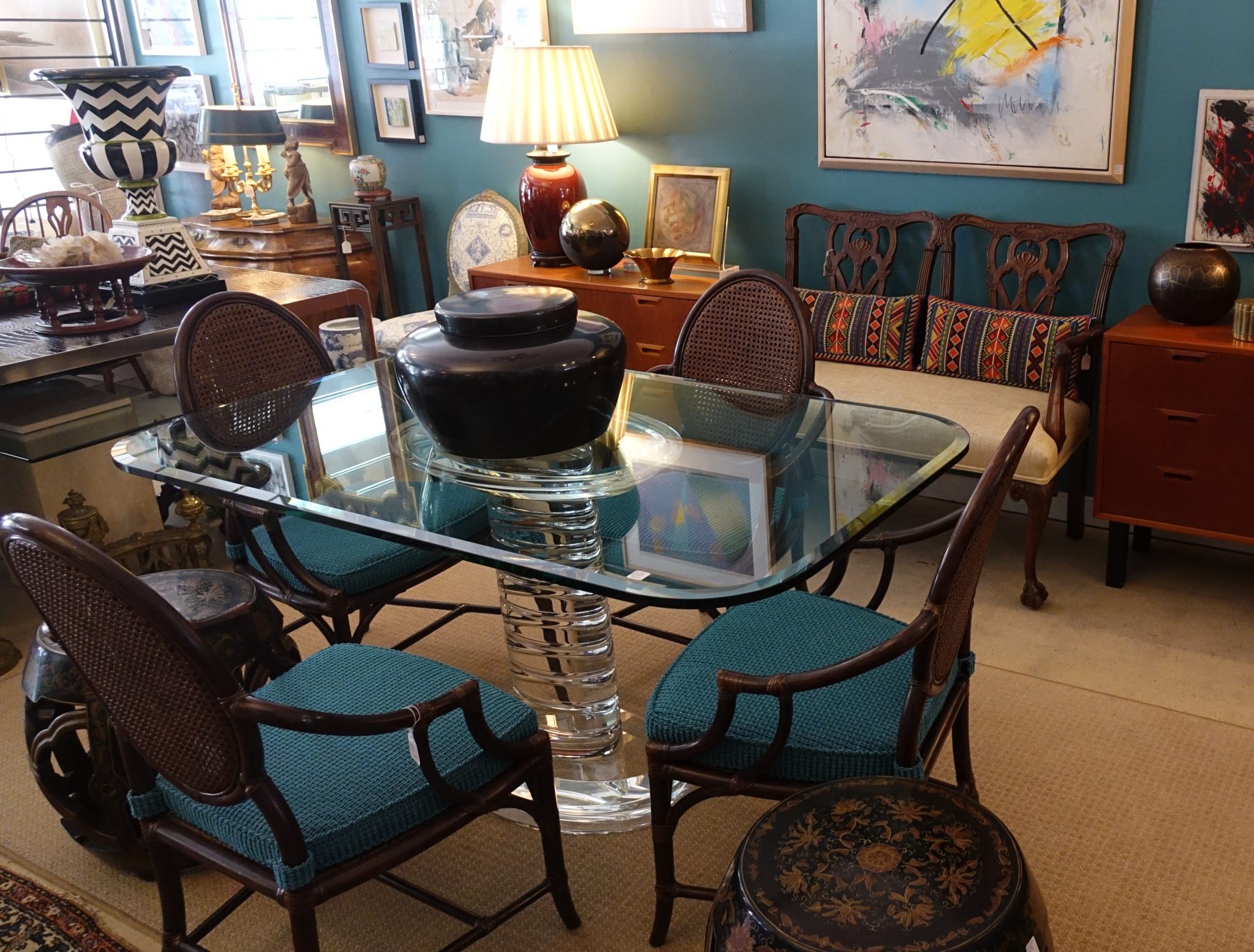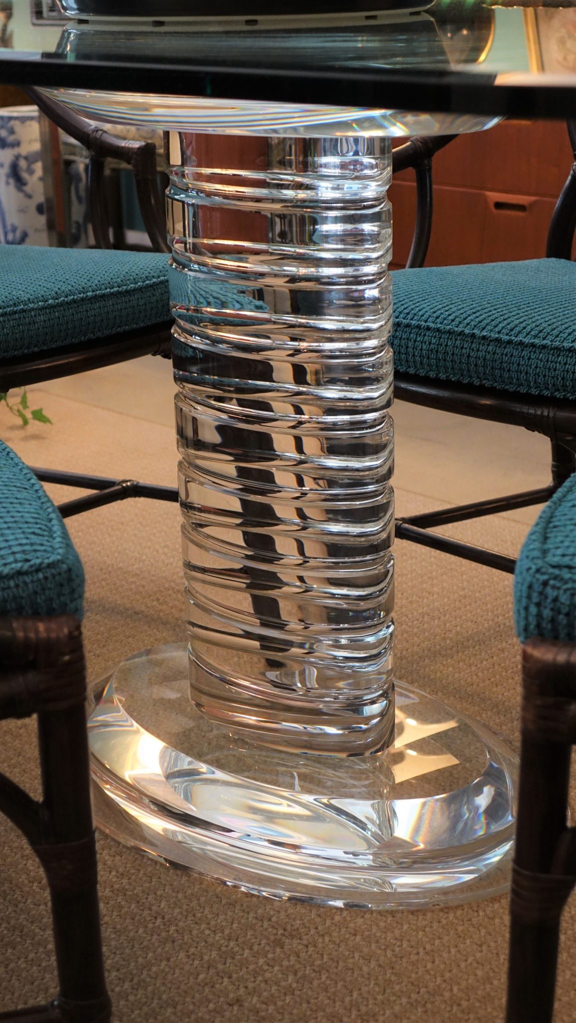 Beautiful vintage Lucite pedestal glass-topped table, solid and heavy.